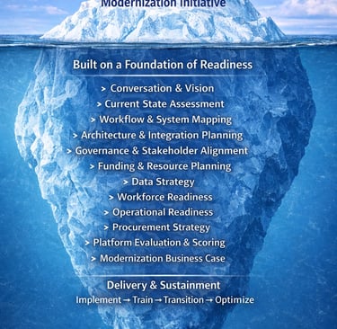 Successful modernization requires readiness across many dimensions of the organization long before a platform is selected or implemented. Leaders must first develop a shared vision and understand the current state of systems, workflows, and operational dependencies. Architecture, integrations, governance structures, and stakeholder alignment all shape the environment in which modernization will occur. Without this foundation, even the most capable technology solutions struggle to deliver lasting value.