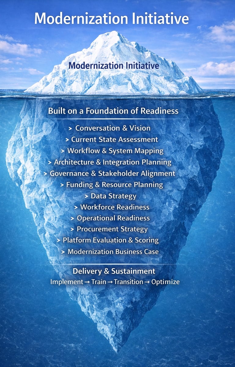 Equally important are the operational elements that determine whether the organization can sustain change. Funding models, workforce readiness, data strategy, and procurement planning play a critical role in determining whether modernization efforts move forward smoothly or stall under complexity. Evaluating platforms, building a defensible business case, and aligning stakeholders are not administrative steps. They are essential components of modernization readiness.